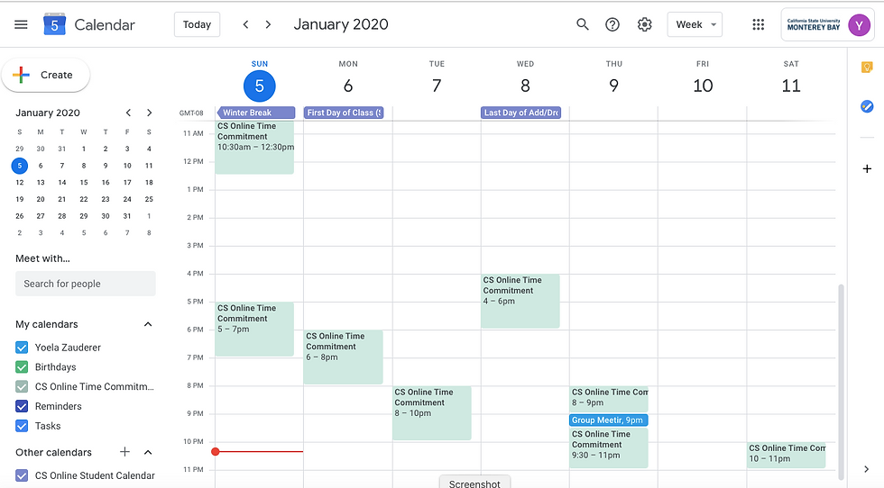 One assignment we were required to turn in before the start of the program was a document detailing the specific times and hours that we would commit to working for this program. I like the way this program is structured such that the modules open Wednesday morning and the assignments are due Tuesday night. As reflected by the calendar below, I can spend short amounts of time at the end of the week beginning the readings, dedicate longer amounts of time over the weekend to begin assignments, and finish up in the beginning of the week. Additionally, my group schedule our weekly meetings for Thursday night.